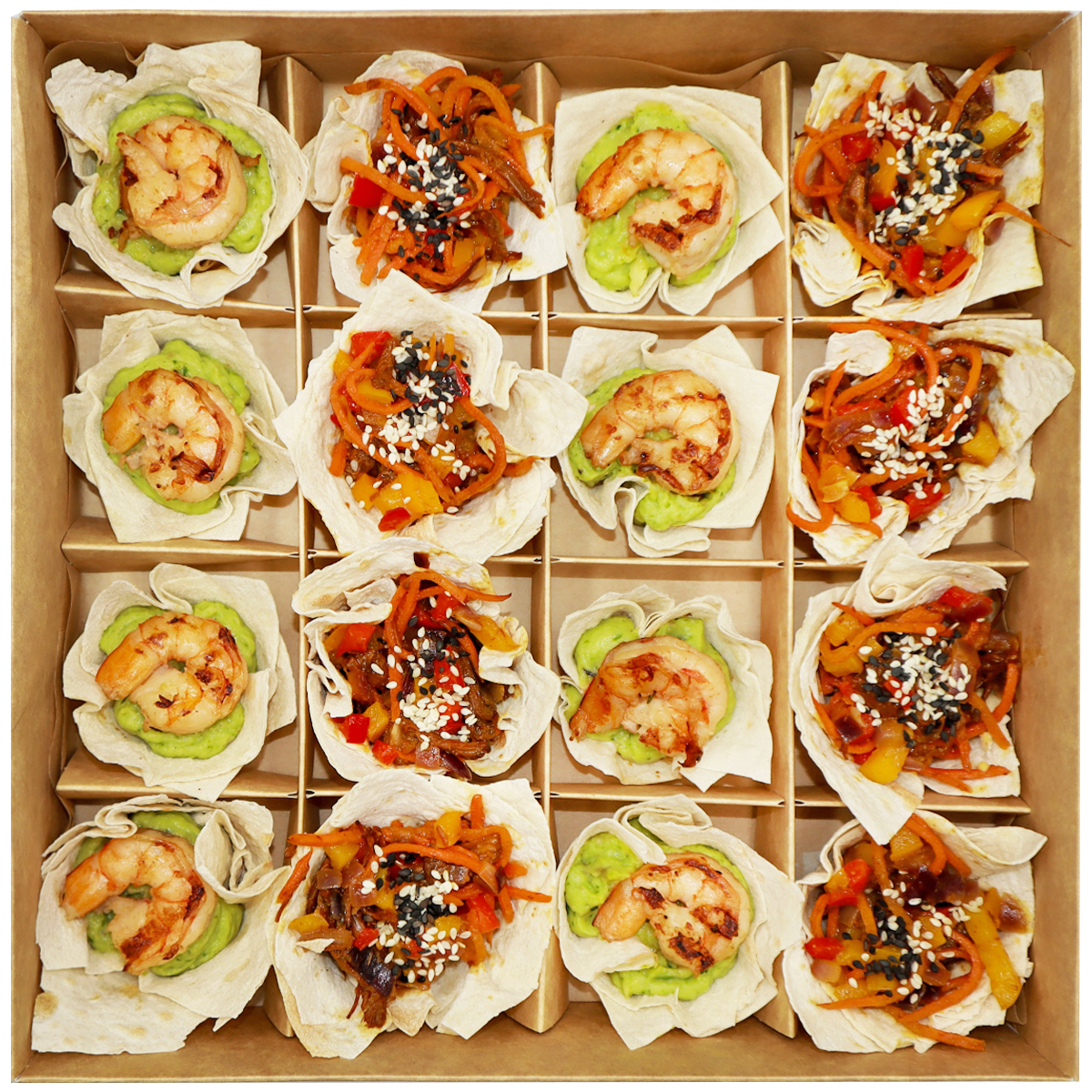 - Корзинки із запеченого лаваша з грильованою креветкою та класичним гуакамоле, перетертим із соком лайма, кінзою, та зірою