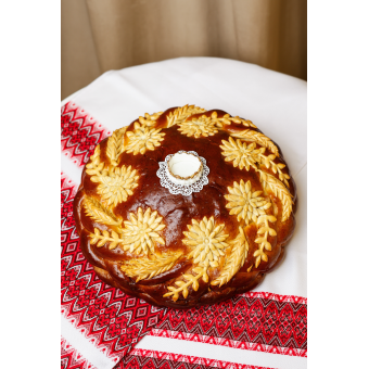 • коровай в українському стилі з калиною, колосками, голубами та квітами з тіста;